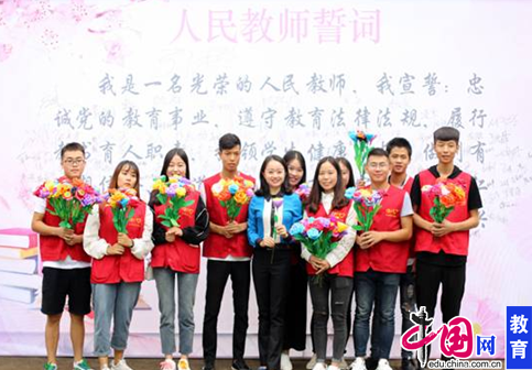 学院领导和老师们在宣誓墙上写下自己的名字,表达自己牢记誓词、践行诺言的坚定决心;学院团委组织青年志愿者和协会学生向与会教师赠送手工礼花,传递学生对教师的节日问候和温馨祝福。