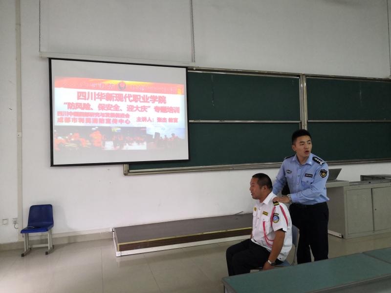 为进一步做好国庆前校园安全工作,提高我院师生员工特别是相关岗位员工的各类安全知识,增强自我防范和保护意识,9月26日下午,保卫处特邀成都应急安全委员会张杰警官,在我院西河校区教学楼214教室,举行了“防风险、保安全、迎大庆”的专题培训。各学院书记、辅导员、学生处相关岗位人员、宿管中心人员、全体宿管员、安保人员、后勤相关人员和各食堂负责人参加了此次培训。