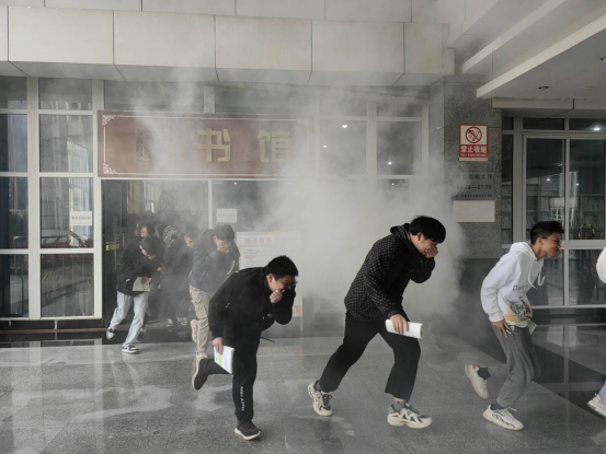 培训结束后,进行消防安全应急疏散演练,全体学生在图书馆工作人员的引导下,依次有序地从安全出口撤离到安全位置,整个演练快速、安全、有序完成。