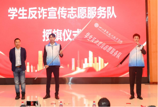 紧接着,在热烈掌声中,党委副书记李瑜为反诈宣传志愿服务队授旗。