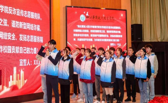 接着,全体反诈志愿者庄严宣誓,“我志愿加入四川华新现代职业学院反诈宣传志愿服务队,识骗防骗从我做起,时刻紧绷防范之弦、谨防新型网络诈骗、积极参与反诈宣传、自觉维护校园网络安全、发扬志愿服务精神、共建和谐平安校园,为共创无诈校园贡献自己的力量!”呼吁大学生共同携手开展防范宣传,掀起反诈浪潮。