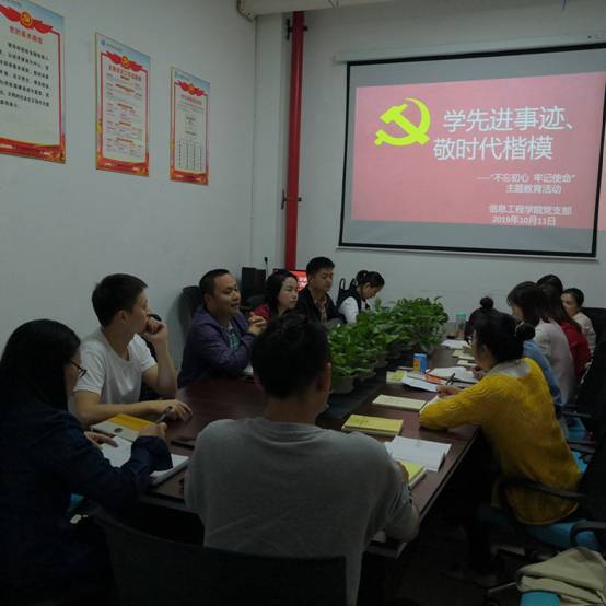 2019年10月11日下午,信息工程学院党支部在西河校区明德楼动漫实训中心111会议室开展了“学先进事迹,敬时代楷模”主题教育活动。同志们结合教学科研、人才培养、管理服务、师德师风建设等中心工作,结合成长成才、志愿奉献、专业和学科特色,开展了理论学习和主题研讨。