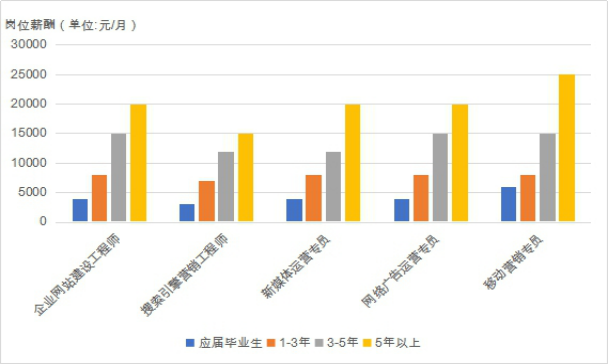 本专业毕业生就业面向互联网企业、电子商务公司以及各类开展电子商务业务的大、中、小型企业,可从事的职位有网页设计师、移动网站建设专员、网站运营专员、SEO优化师、SEM营销专员、DSP网络广告运营、信息流广告优化师、内容策划专员、活动策划化专员、新媒体推广专员等。