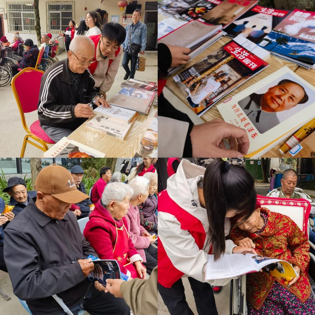 在养老院内,党员同志们为老人们送上亲切的问候和祝福,送去适合老年人阅读的医疗、保健、文学、休闲类的图书,并为视力不好、不识字的老年人现场进行知识讲解,为老人们送上一份特殊的节日关爱。