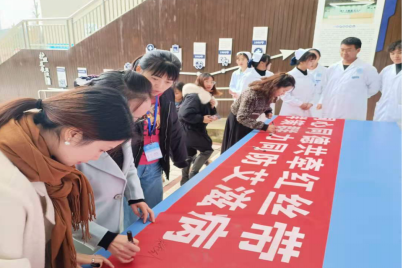 12月1日中午,医护学院在知行楼前开展了主题宣传活动,老师和同学们在横幅上签名,倡议全社会共同携手防疫抗艾,共担健康责任。同时参加活动的师生都佩戴上红丝带,呼吁全社会关注艾滋病的防治问题,减少对艾滋病患者的歧视。“防艾抗艾,关系到我们每一个人的生活,青年学子需要进一步增强防艾意识。”一名护理专业的同学这样表示。