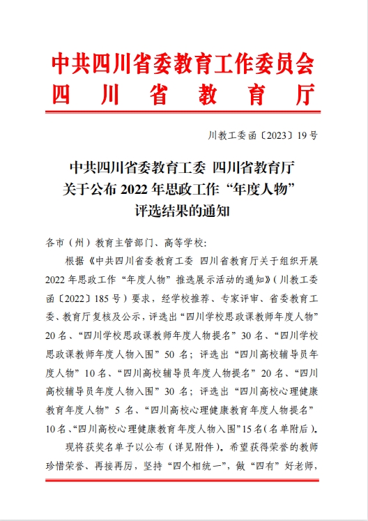 日前,中共四川省委教育工委 四川省教育厅公布了2022 年思政工作“年度人物”评选结果。经学院推荐、专家评审、省委教育工委、教育厅复核及公示,评选出“四川高校心理健康教育年度人物”5名、“四川高校心理健康教育年度人物提名”10名、“四川高校心理健康教育年度人物入围”15名。华新学院医护学院副院长、心理健康中心副主任陈蒂丝在评选中进入前15名,荣获“四川高校心理健康教育年度人物提名”奖。华新学院是此奖项省内唯一获选的民办高职院校。
