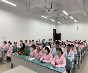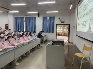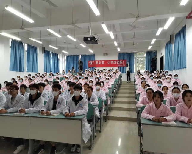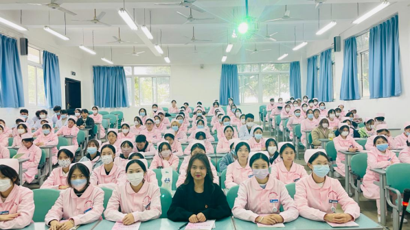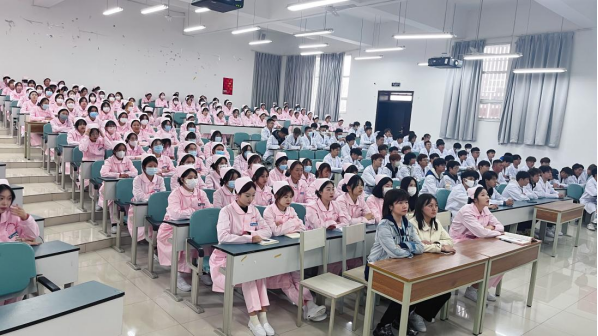 本次课程采取现场直播的形式进行,医护康养学院的学生们统一着装,以饱满的热情认真聆听,将课堂打造成一道亮丽的风景线。