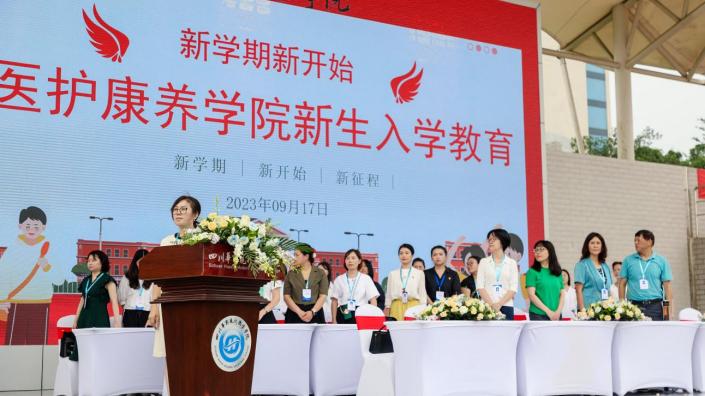 大会在庄严的国歌声中拉开序幕,学院副院长何红作了重要讲话。希望新同学们做到以下四点:一是明德修身、志存高远。二是潜心读书、研修专业。希望同学们秉承“厚德、励志、精技、笃行”的校训,以“衣带渐宽终不悔,为伊消得人憔悴”的坚毅和执着,扎实掌握基础知识和基本技能,不断丰富医学实践,为将来成为一名合格的护士打牢基础。三是学会独立,学会做人。四是善于规划,未来可期。要全面提升专业技能,多渠道参与技能培训,多争取参加技能大赛,多考取技能证书。
