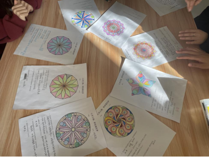 通过正念冥想,全体参与者进入了放松状态。王老师带领大家开始曼陀罗绘画,在明确绘画规则后,引导同学们听从内心的想法、抓住当下的感受,用色彩将心里的任何情绪、想法、意境、故事表达出来,绘制出独属于自己的曼陀罗绘画作品。结束后,请大家为自己的作品起一个名字,并分享绘画时的所思所想、所感所悟,包括绘画时的情绪状态、作品与自己内在的连接等。同学们纷纷表示,在绘画过程中收获了内心的平静与祥和。