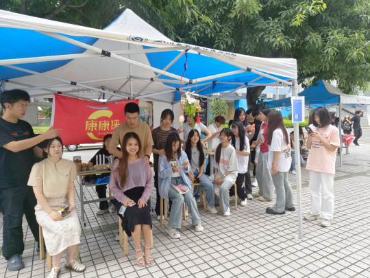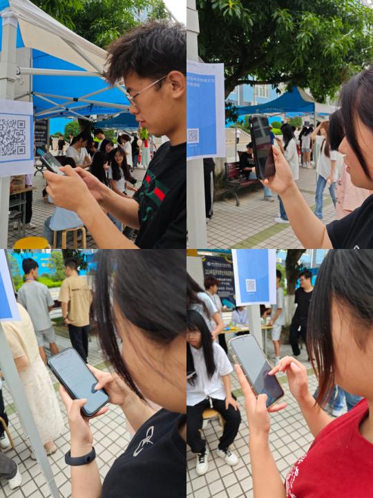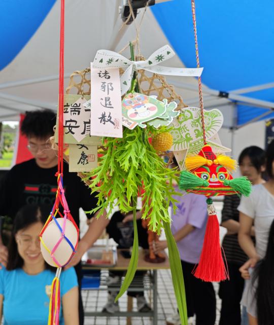 活动开始,社团成员们精心布置了活动场地,遮阳棚上悬挂着五彩斑斓的端午节装饰物,营造出一种浓厚的节日氛围。当然啦,还有我们的主角——调查问卷二维码。