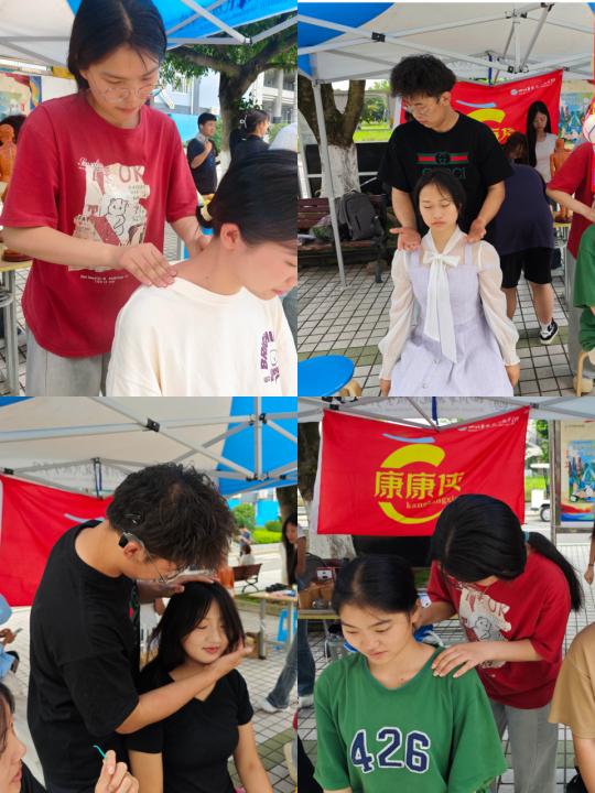 除了调查问卷,我们还给同学们安排了按摩服务,在按摩的同时也会教他们一些相应的穴位和按摩知识,让他们自己可以和自己的室友朋友相互按摩,同学们也是非常的热情,都很想体验了解。