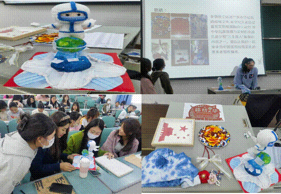 该实践方式在很多专业中运用广泛,不仅促进学生搞懂课程的原理,还锻炼实操动手能力、培养审美能力等。比如,在学习《建设社会主义文化强国》这一专题时,学生积极推动非遗传承,通过创造性转化、创新性发展发扬传统手艺,结合钩针编织技艺,完成创新作品《致敬“孤勇者”》,该作品创意饱含深意:“萤火之光点亮璀璨星河--致敬‘孤勇者’,谁说只有站在光里的才算英雄,总有平凡的人做着不平凡的事。在疫情期间,他们敢于逆风而行,如萤火一般,有一分热,发一分光,点亮璀璨星河,照亮每一座城市!最终他们历经坎坷,护山河无恙,人间皆安,迎来了地球的‘春天’。” 系列作品充分展现了学生在“学”中“创”,在“创”中“学”,鼓励更多人做传统文化的“继承者”、创新创意的“引领者”。