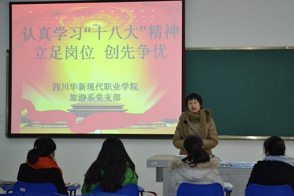 为深入学习宣传贯彻十八大会议精神,促进党支部又好又快发展,1219上午,旅游思政支部在实训楼  旅游系多媒体教室召开支部会议,专题学习传达十八大报告精神。会议由刘依灵书记主持,支部全体党员参加了此次会议。