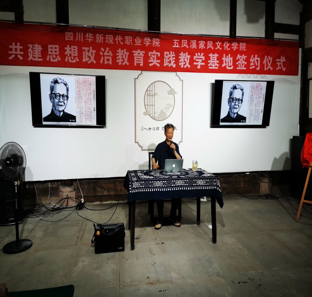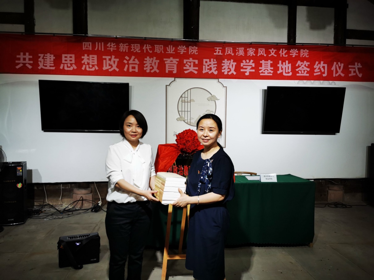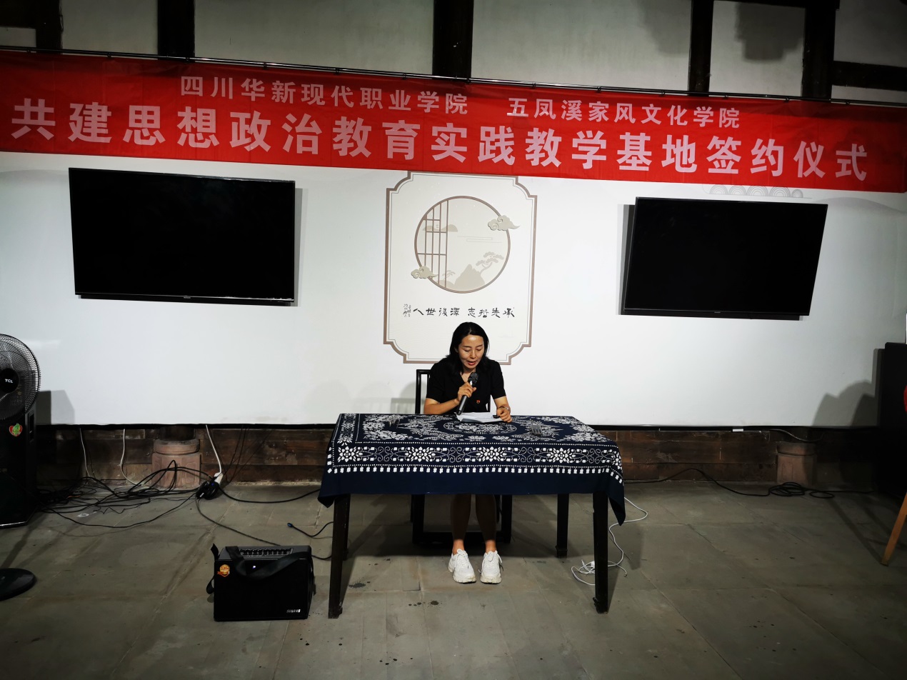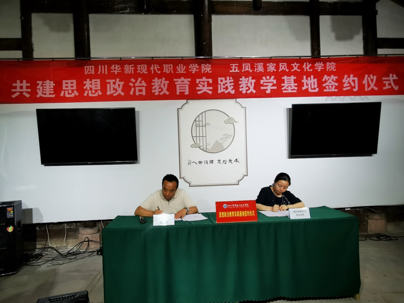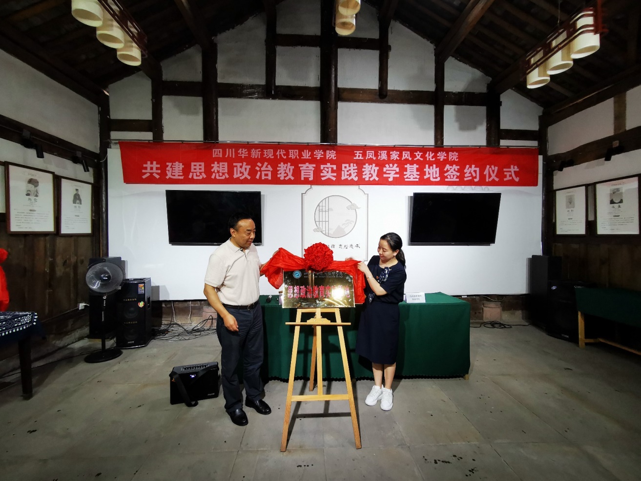 何敏与贺杰共同为思政教育实践基地揭牌。贺杰院长介绍了五凤溪家风文化学院的相关情况。他表示,在贺麟故居设立教育实践基地,可以让党员师生更直观地了解现代哲学家贺麟的家国情怀,传承良好家风文化。希望通过共建进一步搭建好育人平台,实现立德树人的根本目标。仪式上,双方本着“长期共建、共同育人”的原则,签订了思想政治教育实践基地共建协议,并举行了揭牌仪式。何敏代表华新学院对五凤溪家风文化学院的支持表示感谢。