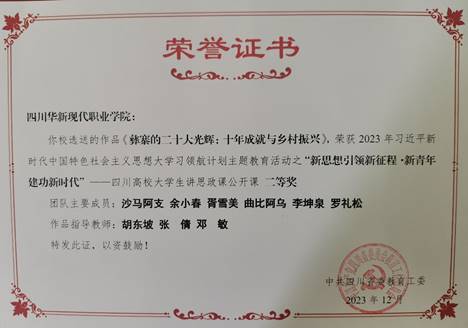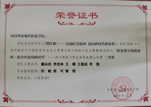 【马克思主义学院胡东坡报道】4月15日,四川华新现代职业学院收到中共四川省委教育工委颁发的荣誉证书,马克思主义学院参加2023年习近平新时代中国特色社会主义思想大学习领航计划主题教育活动,指导选送的两部作品均获“新思想引领新征程•新青年建功新时代”四川高校大学生讲思政课公开课二等奖。