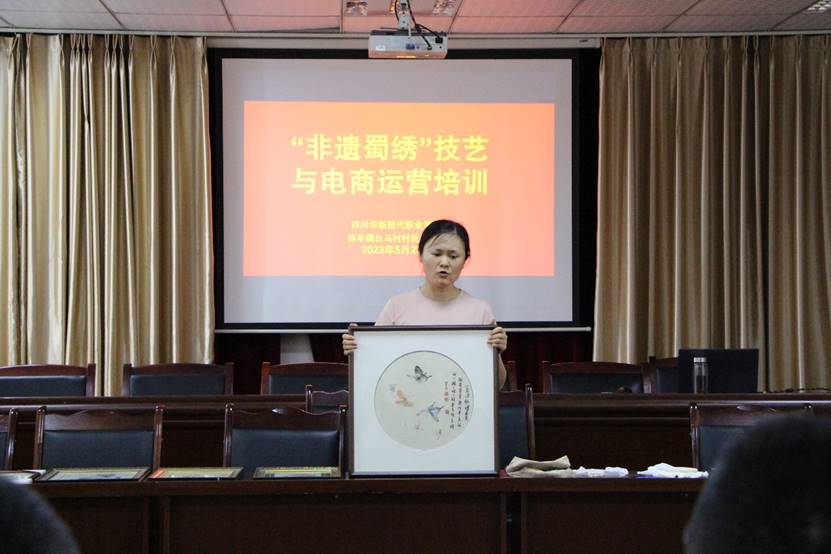 在培训中,胡晓详细介绍了非物质文化遗产蜀绣的悠久历史和独特技艺,向参训人员生动展示了我院蜀绣专业的魅力。与此同时,刘毅副院长为参训人员讲解了校地双方搭建电商平台、引入蜀绣产品运营的思路,探讨了蜀绣在电商领域的发展潜力。