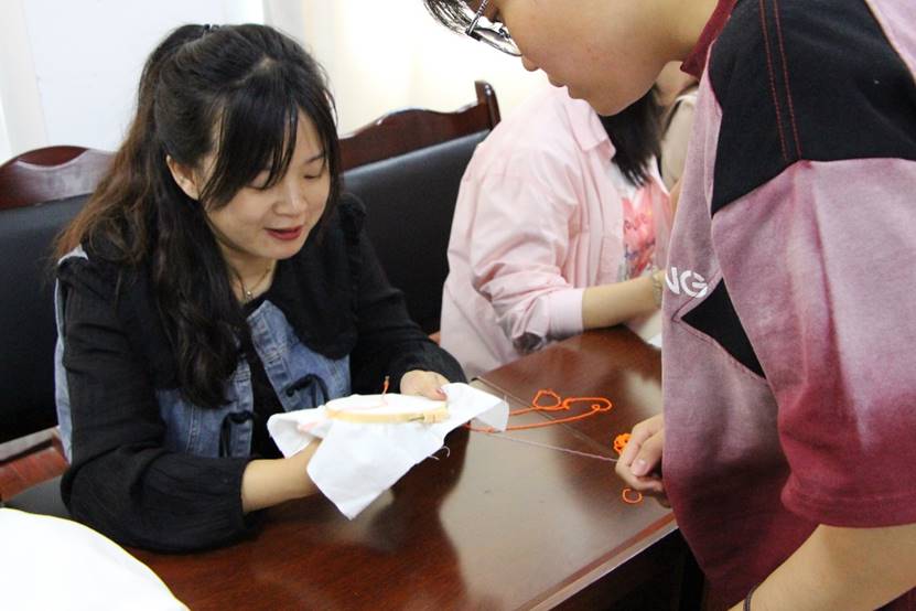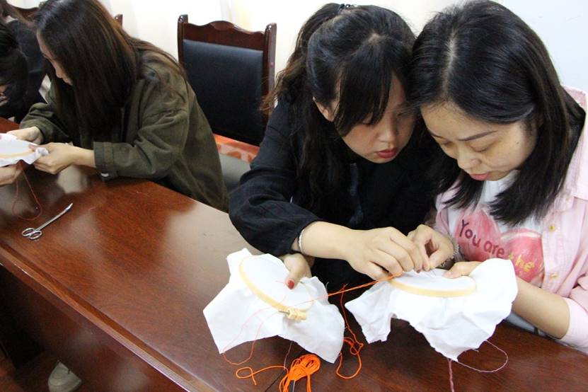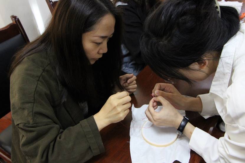 培训现场,参训人员积极踊跃,亲自动手拿起绣针学习蜀绣的针法技艺,体验了蜀绣的独特韵味。胡晓老师和蜀绣技艺与工艺专业的学生耐心指导,让大家在穿梭的一针一线中体验蜀绣的魅力。