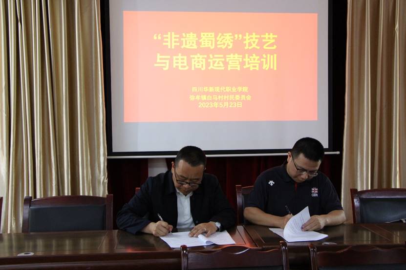 在活动的尾声,白马村支部书记、村委会主任孟天勇与刘毅副院长代表校地双方签署了"蜀绣绣娘合作协议"。该协议的签署旨在促进乡村振兴,提高乡村富余劳动力的收入。通过此次合作,非遗蜀绣技艺将得到进一步传承和推广,同时也为学生们提供了一个创业的机会。该项目的成功合作不仅将推动蜀绣技艺在电商领域的发展,还为当地乡村经济注入了新的活力。未来,预计将有更多的学生通过校地合作实训平台进行实践创业,将蜀绣产品打造成具有市场竞争力的品牌,为乡村振兴做出更大贡献。