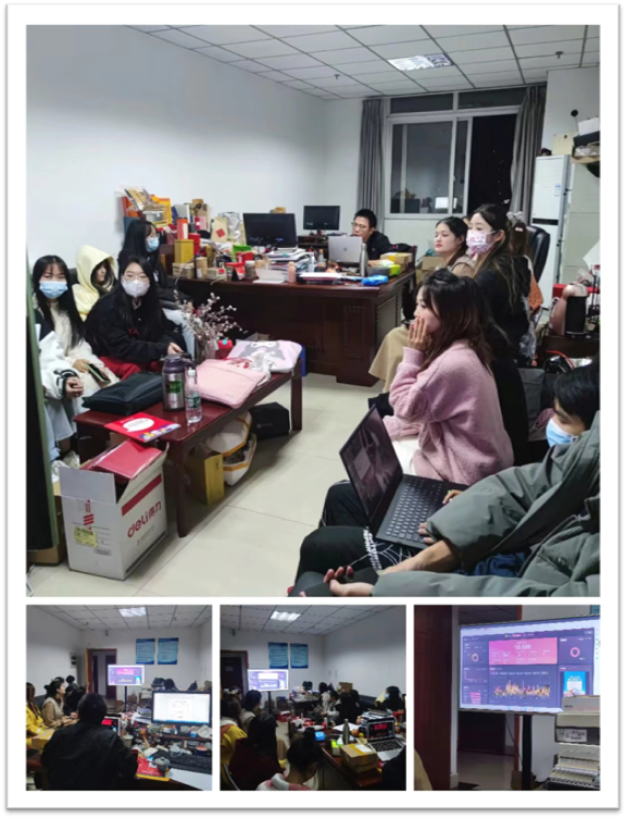 电商学院高度重视和支持本次直播实训活动,刘毅副院长在直播现场指导实训团队。直播结束后,刘毅副院长将实训团队的同学召集到616办公室,通过直播后台数据看板对直播活动进行诊断,分析流量渠道、观看时长、成交订单数量等数据,梳理直播间流量、用户的精准度,优化主播话术,提出优化策略,为下一次直播做铺垫。