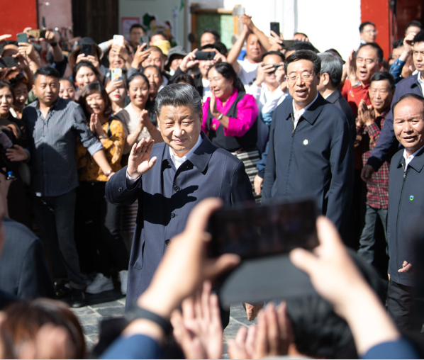 7月21日至23日,中共中央总书记、国家主席、中央军委主席习近平来到西藏,祝贺西藏和平解放70周年,看望慰问西藏各族干部群众。这是22日下午,习近平在考察位于拉萨市老城区的八廓街时,向各族群众挥手致意。新华社记者 申宏 摄