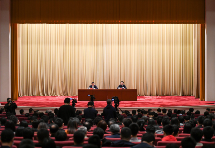3月16日,中央宣讲团成员、中央党史和文献研究院院长曲青山(右)在报告会上作宣讲报告。新华社记者 陈晔华 摄