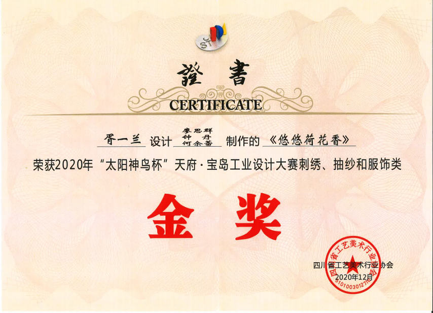 胥一兰:2013年蜀绣专业毕业生。在校期间作品获得 2011“天工艺苑·百花杯”中国工艺美术精品优胜奖、“锦绣四川”2011年四川工艺美术作品展中获优胜奖、2013年3月创意作品荣获2011—2013年成都市蜀绣优秀创意作品优秀创意奖。2012年8月刺绣作品《牡丹图》入选“2012中国当代刺绣艺术大展”,因个人功底扎实、专业突出,毕业后留校任教,先后指导学生刺绣、作品分别获省、市、国家级各项大奖。2017年荣获“濯锦工匠”称号;2020年全国行业职业技能大赛荣获“工艺美术行业技术能手”称号。