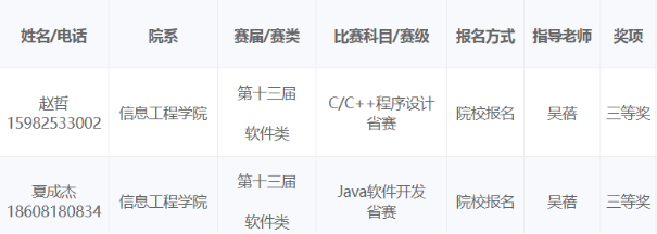受新冠疫情影响,我校参赛选手参加本次比赛可谓一波三折,临到比赛前两天,我校突发状况,按疫情防控要求封校,只能临时改为线上比赛。我校参赛选手面对疫情的影响,选择迎难而上,在图书馆、在宿舍、在家、甚至在隔离点在线完成了此次赛事,彰显了当代大学生积极向上,勇于拼搏的精神风采。最终,2020级软件技术1班的夏成杰同学获得Java软件开发大学C组省赛三等奖,2021级软件技术1班的赵哲同学获得C/C++程序设计大学C组省赛三等奖。