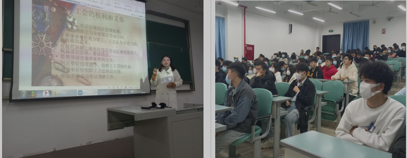 蔡老师首先分别从工会的起源、中国工会的发展、我国工会的性质、工会的职责、工会组织、工会的权利和义务、工会经费、工会经费管理、当前工会工作重点、相关工会法规几个方面向同学们讲解了有关工会的小知识,在遇到一些关键性问题的时候,蔡老师都会额外提醒各位同学认真记住关乎自身切身利益的相关事宜,比如实习期单位也应在入职首月给职员购买社保,公积金是在转正后办理等。