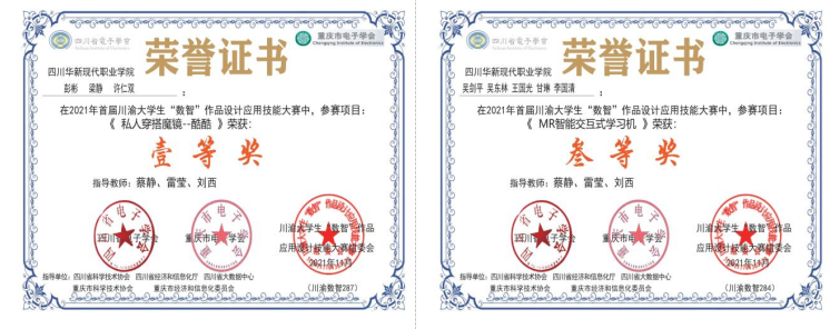 经过为期一个多月的细心准备与反复讨论,由我院蔡静老师指导,雷莹、刘西老师协助的两个参赛团队的作品《私人穿搭魔镜——酷酷》以及《MR智能交互学习机》在近300多个参赛作品中,通过激烈角逐,分别获得大赛的一等奖及三等奖,取得圆满成功,为我校争得了荣誉!