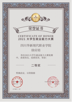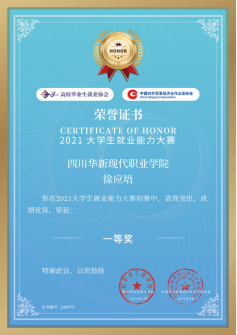 近日,信息工程学院20级计算机应用技术1班徐应培同学参加了由高校毕业生就业协会和中外贸易合作企业协会联合主办的“2021年全国大学生就业能力大赛”,此次大赛有全国2215所高校共17420名同学参赛。我院徐应培同学初赛获得一等奖进入复赛,复赛通过提交个人简历、职业规划书和自我介绍视频,经过一个多月的评审,最终在复赛中获得二等奖。
