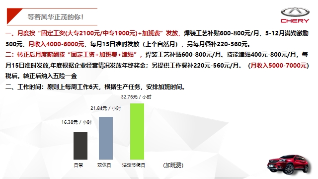 由公司统一分配在整车及零部件等生产部门,从事生产一线冲压、焊接、涂装、总装、发动机、物流等工作。
