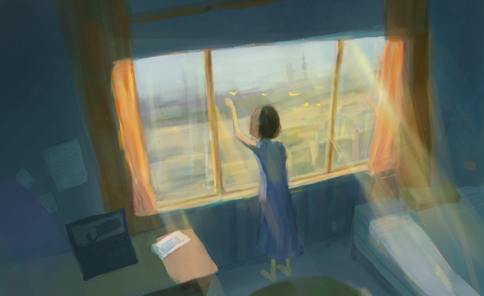 我的创作题目是“平静的2022”,这是一幅场景插画。前期找参考资料时看到一些阳光透过窗户的照片,就构思出了这幅画面。
