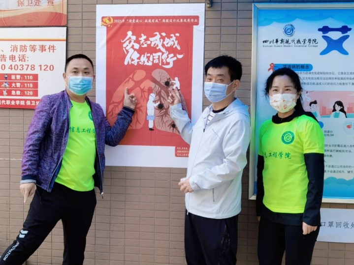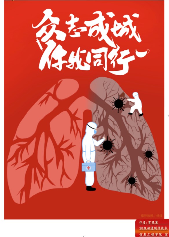 这些优秀作品被展示在芳华阁A区二楼“信e家”爱国文化社区,展示在博学楼、明德楼、食堂、宿舍等公共区域。“生命重于泰山,疫情就是命令,防控就是责任。”信工学院师生用满腔热忱与创意设计,创作出最能反映当前科学防控感染、万众一心、众志成城抗击疫情精神的公益海报设计作品,鼓舞“士”气,心手相牵,合力战“疫”,期待战“疫”早日取得胜利!
