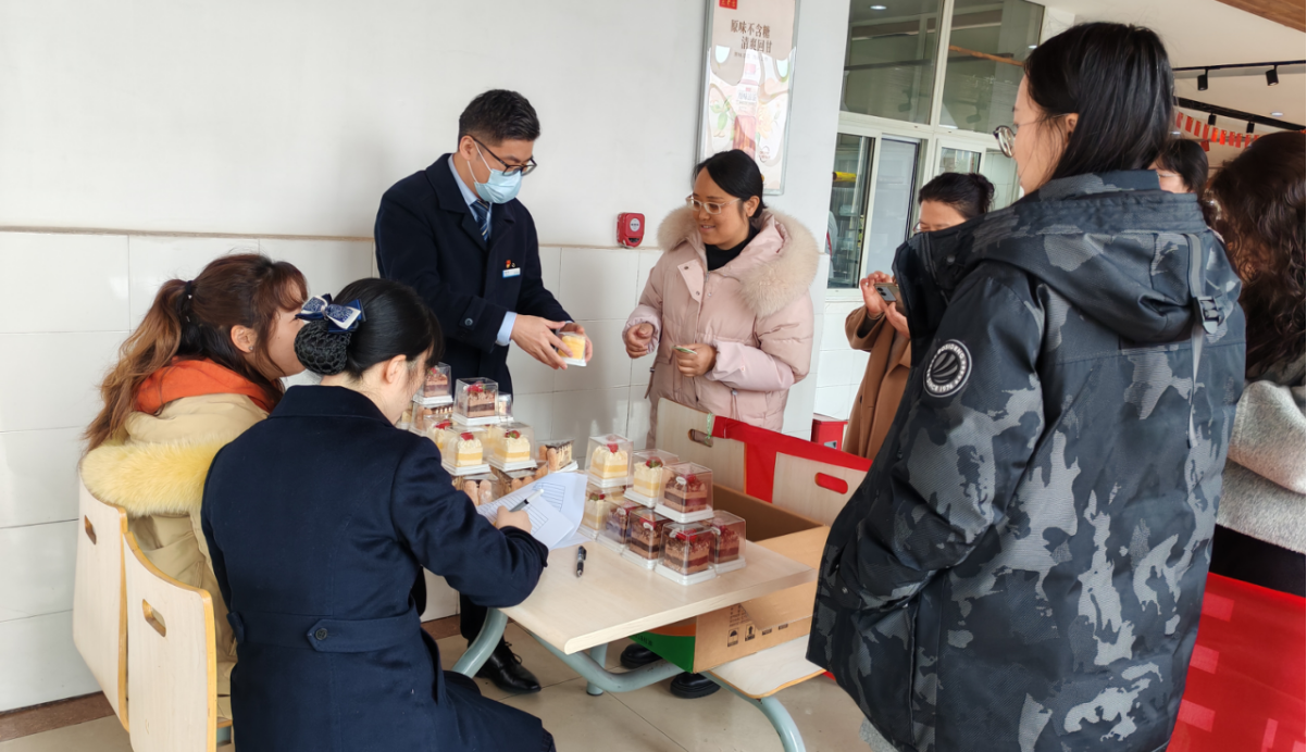 活动当天,食堂二楼布置温馨,洋溢着节日的喜庆氛围。由两个党支部党员代表组成的服务团队早早到场,将精心准备的节日小蛋糕整齐摆放。每一份蛋糕均饱含着对女教职工辛勤付出的诚挚感谢。建行十陵支行还为活动提供了专属节日礼品,进一步彰显银校合作的社会责任感。上午11时起,女教职工们陆续抵达活动现场。党员志愿者们热情地为每位女教师送上节日礼包,并致以节日问候。后勤基建资产财务党支部书记常锐表示:“女教职工是学院发展的‘半边天’,无论是教学科研还是管理服务,都展现了坚韧与智慧。我们希望通过这样的活动,让她们感受到党组织的关怀与温暖。”建行十陵支行负责人也提到:“与高校联合开展党建活动,既能深化银校合作,也能以实际行动践行服务社会的初心。”