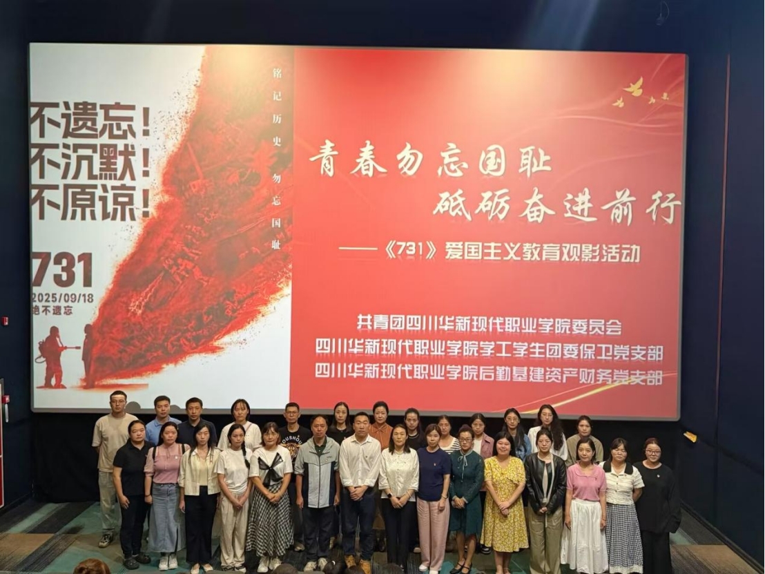 为为纪念中国人民抗日战争暨世界反法西斯战争胜利80周年,进一步加强爱国主义教育,传承红色基因,9月18日,学工学生团委保卫党支部、后勤基建资产财务党支部、教育学院、数字经济学院、院团委70名学生前往西河博林广场店(保利万和国际影楼)开展“传承红色基因,弘扬伟大抗战精神”主题党日活动,集体观看爱国主义影片《731》。