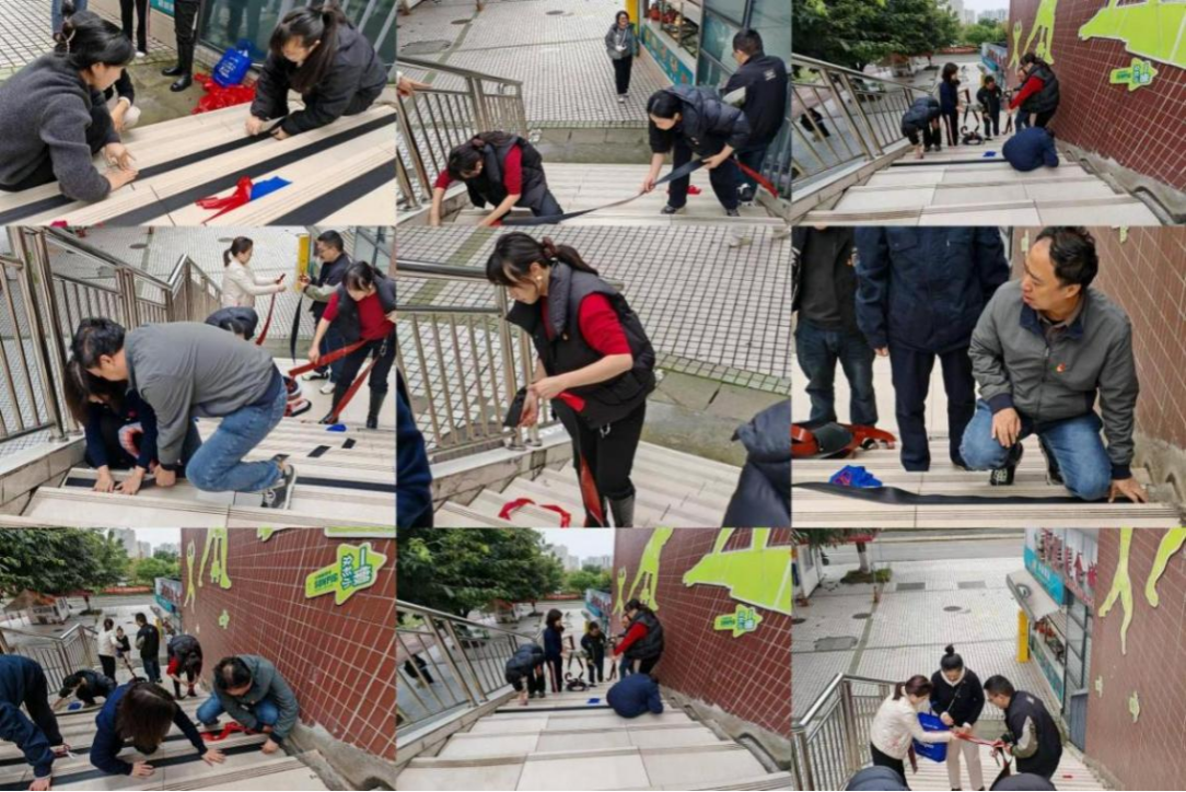 本次活动聚焦师生校园安全实际需求,针对校园内高频使用、易滑风险较高的室外楼梯,集中进行防滑条粘贴,着力解决师生关心的实际问题。