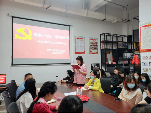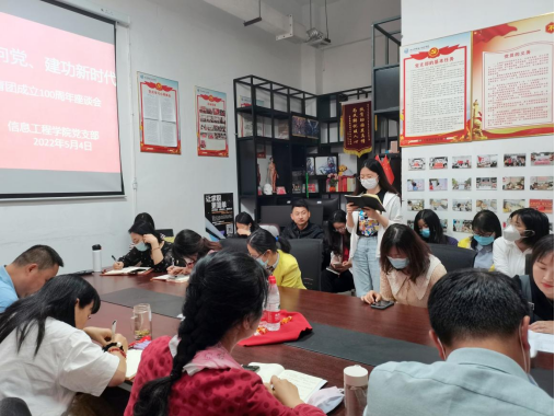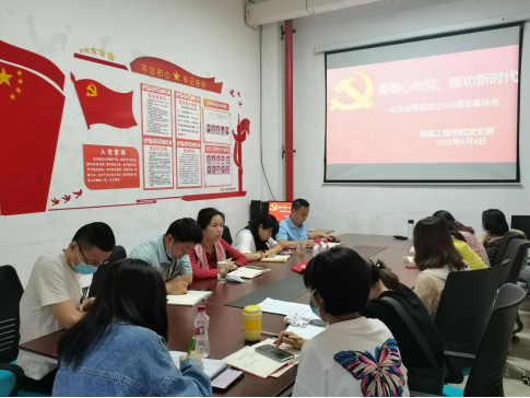 信工学院于2022年5月4日下午13点30在明德楼111开展“不懈奋斗,习近平这样寄语青年”——纪念共青团成立100周年座谈会,此次座谈会由信工学院院长孙继荣、书记李凡主持,全体教师参加。