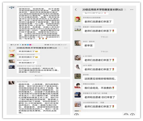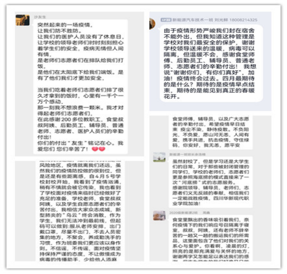 疫情无情人有情。为确保隔离在寝室同学的生活所需,学校100多位教职员工以校为家,白天为同学们做餐食配送、疫情防控相关工作,晚上大家则就地就寝,有的在食堂的餐椅睡觉,有的在办公室的沙发上,有的则是就地打地铺,异常艰苦。但是,他们有的即便已经病倒,但为了学生的安全,最后却总是能够克服;几十位学生志愿者也是起早贪黑,协助老师们开展工作……看到这些,应用技术学院党支部及时在学生中间通报情况,将师生们工作的图片发给大家,引发了同学们的共情。大家深有感触,结合自己在寝室隔离却能够感受到学校无微不至的关照,有感而发,通过微信向学院抗疫一线的师生们发来了感谢词。