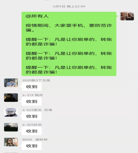 疫情隔离期间,同学们频繁上网,刷手机,在这里面也存在很多安全隐患,学院一是及时引导同学们要有法制意识,不能随意发布有关疫情的消息、视频。二是及时引导学生们防范网络诈骗,提醒同学们凡是刷单的、转账的,都是诈骗,一定要提高警惕,切勿上当受骗。