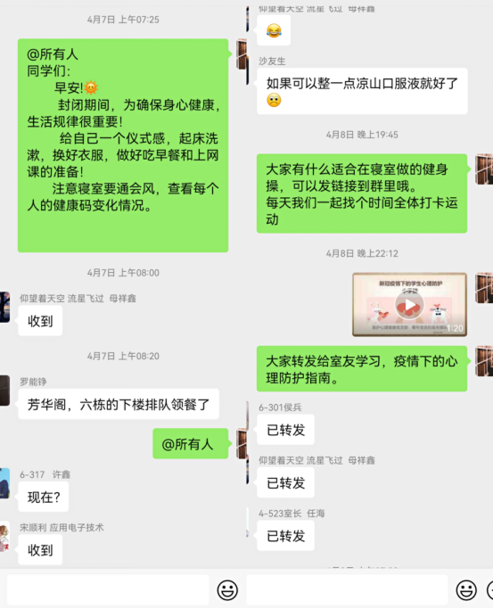 学院一是针对集中封闭管理的寝室同学,通过室长群,每天早上、晚上定时发去老师们对大家的问候、及时在群里发布学校疫情防控最新情况、在群里为同学们点歌、鼓励寝室成员运动打卡、发布一些心理健康保健的学习贴士。