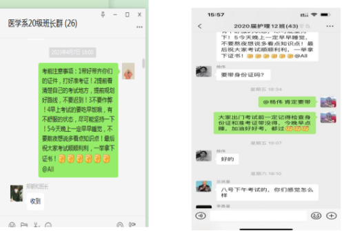 2020级的两位辅导员老师也定期监督同学们复习,时刻关注考试时间、准考证打印、考试地点等情况,第一时间通知到学生,在考试前也发通知到各班长群,同学们qq群等提醒学生考前注意事项,考试要求等,祝同学们考试顺利。