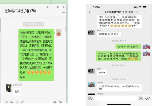2020级的两位辅导员老师也定期监督同学们复习,时刻关注考试时间、准考证打印、考试地点等情况。在考试前也发通知到各班长群,班级QQ群提醒学生考前注意事项,考试要求等,并祝同学们考试顺利。