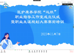 2023年11月7日,医护康养学院举行 “远航”职业指导工作室成立仪式暨职业生涯规划大赛赛前培训。杨敏老师给同学们详细讲解了职业生涯规划书如何撰写以及PPT展示制作的技巧,并倡导同学们积极参加大学生职业规划大赛,不断锻炼自己,提升自己的个人能力。此次会议为的是帮助同学进行自我认定、明确职业奋斗目标、促进大家有效且可持续职业发展,让同学们进一步了解职业生涯规划大赛,全力有方向去准备这项赛事。