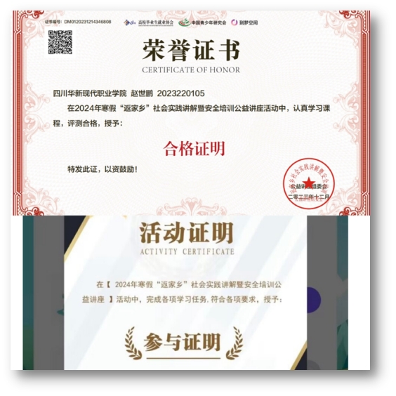 2022级康复2班罗金萍和2023级康复10班赵世鹏,让安全意识吹拂每家每户,健健康康迎新春。他参加了“社会实践讲解暨安全培训公益讲座”活动并获得相应表彰。通过本次活动,积极向家人,朋友等传播安全防范知识,既提高了返乡安全意识,也提高了自身安全技能。