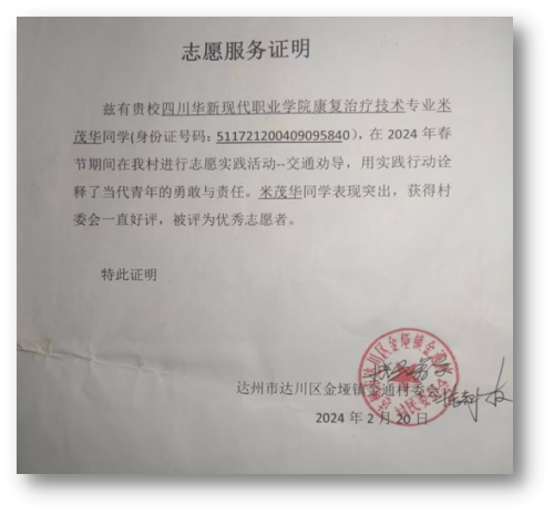 2023级康复治疗技术2班米茂华,平安是一切希望的起点,“文明千万条,安全第一条”,他在寒假期间参与交通劝导活动,让驾驶司机有序行车,行人遵守交规。