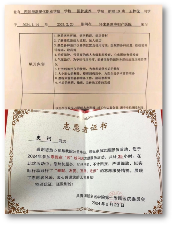 2023级护理10班的王梓优和史柯,践行“奉献,友爱,互助,进步”的志愿者服务精神。她参加了怀来新世济妇产医院“返家乡医护医疗活动”。通过专业知识和操作技能,对病人悉心照顾、耐心解答病人的疑虑等,保持严谨、认真的工作态度,践行了南丁格尔精神。