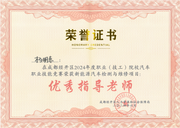 坚持以赛促教,教师教学能力大幅提升。“打铁还需自身硬”,职业院校技能竞赛,不仅“考学生”,更“考老师”。要指导学生参赛,教师就必须是专业领域的行家里手。在院内建立起一支“能教会赛”的高素质“双师型”教师队伍,正是智能建造与制造学院完善技能人才培养链的关键一招和核心举措,通过以赛促教,学院教师教育教学能力大幅提升,在2024年6月成都市经开区汽车维修职业技能大赛中获得2个一等奖,汽车汽车维修赛项排名第一,指导教师杨明东获得优秀指导教师称号。