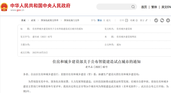 在国家政策的大力引导下,住房和城乡建设部根据《国民经济和社会发展第十四个五年规划和 2035 年远景目标纲要》关于发展智能建造的部署要求,于2022年11月9日印发《关于公布智能建造试点城市的通知》,北京市等在内的24个城市入选智能建造试点城市,积极探索建筑业转型发展的新路径。