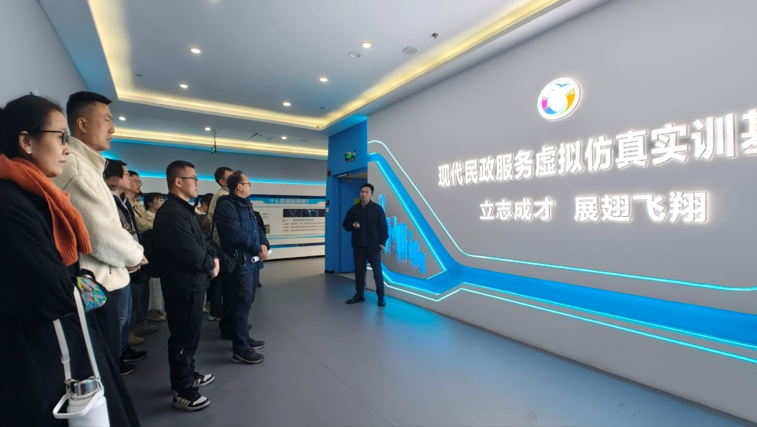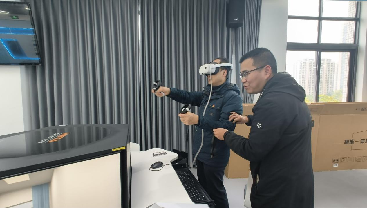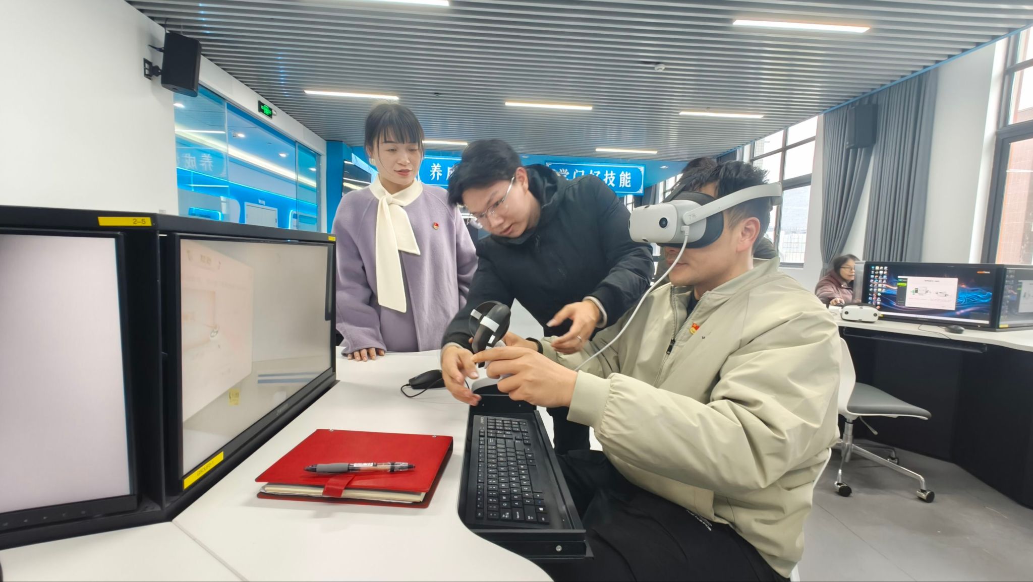 接下来,支部党员来到了学校的国家级“现代民政服务虚拟仿真实训基地”,戴上VR头盔和操作手柄,深入体验了先进的VR虚拟仿真课程实训操作。作为服务区域产业发展的重要平台,该基地紧密对接成都 “5+5+1” 现代产业体系,聚焦现代民政服务、新能源汽车。党员教师们实地察看了实训场地、设备配置及人才培养成果展示,详细了解基地在对接产业需求、培育高技能人才、服务地方经济发展等方面的实践经验。
