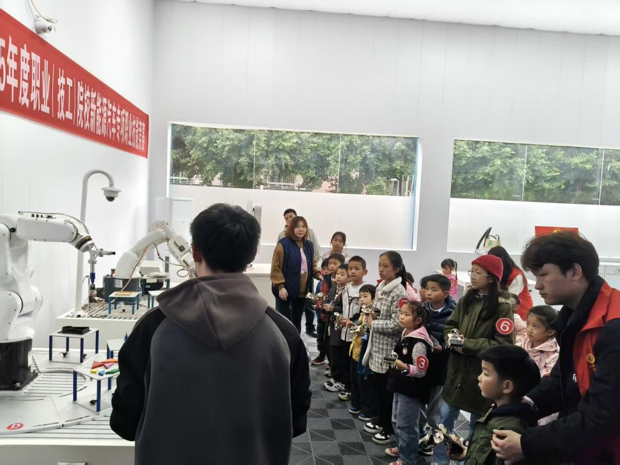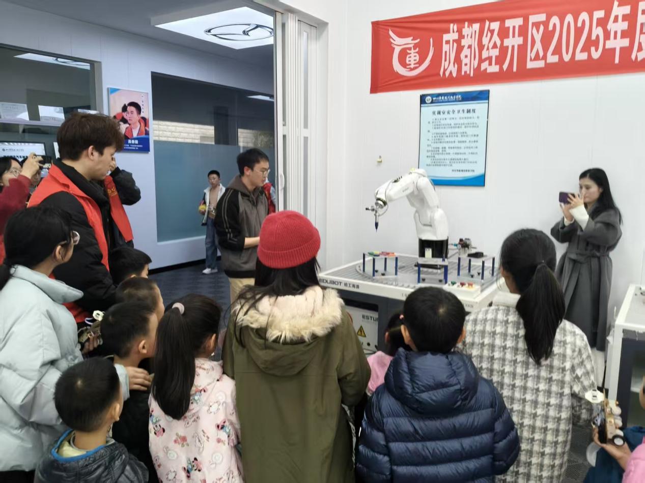 活动尾声,小朋友们还参观了学院的新能源汽车综合实训区,近距离接触智能制造相关实训设备。作为成都经开区科普资源联动的重要场次,本次活动以“讲解+实操+参观”的模式,将工业机械臂、智能控制等前沿技术转化为青少年可感知、可参与的实践内容。
